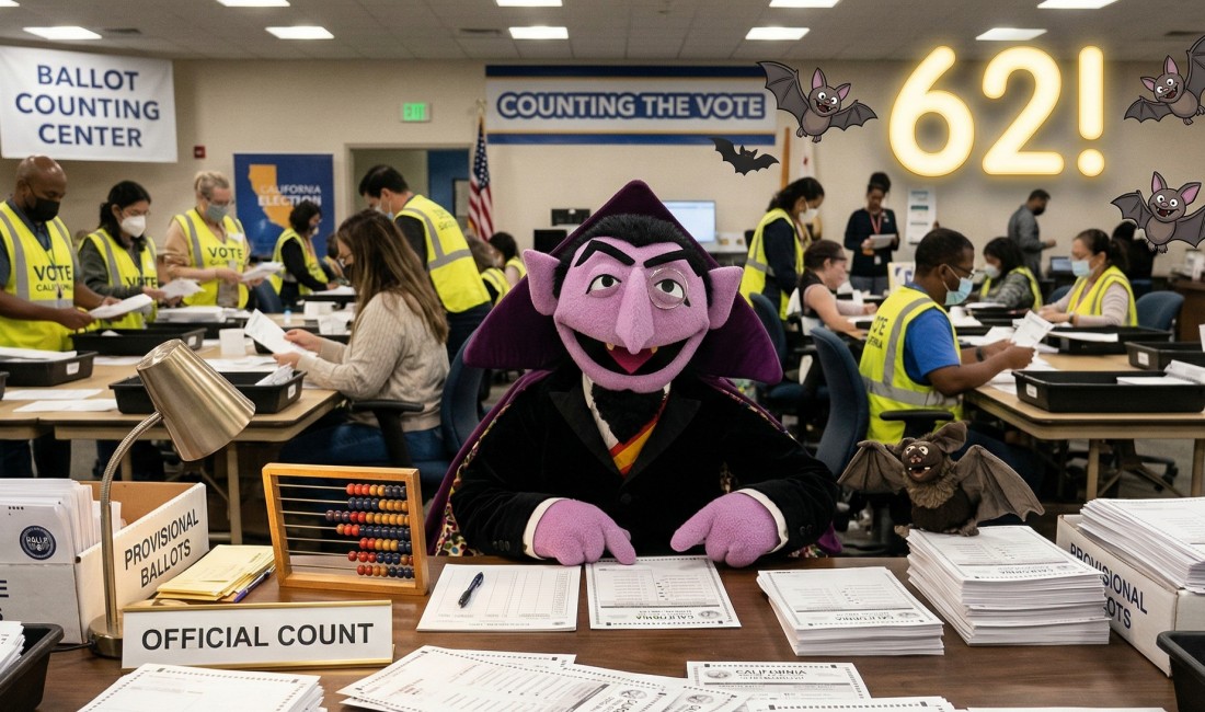 Thank you for waiting, America, while it took this Californian a little longer to count. I know that you get impatient when we Californians count too slowly for you, especially when we are counting votes.