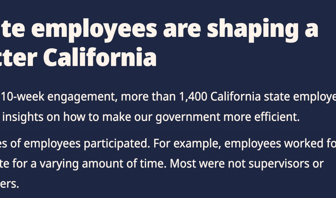State workers suggested eliminating unnecessary rules, forms, and slow handoffs that caused delays. They asked for less paper and better digital tools and records. They called for the state to listen more to California residents, and to improve research capacity to design better services (by, for instance, establishing internal think tanks).