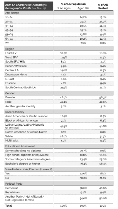As part of this effort, Rewrite LA convened a Mini-Assembly on December 13, 2025, designed and implemented by Public Democracy Los Angeles, a volunteer-led coalition promoting civic engagement in Los Angeles, to provide input to the Los Angeles Charter Reform Commission. The Mini-Assembly adapted the model of a larger citywide Civic Assembly in which residents are selected by lottery and convened over an extended period to learn, deliberate, and offer collective recommendations on complex policy issues.